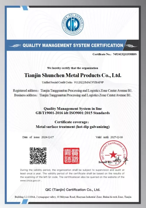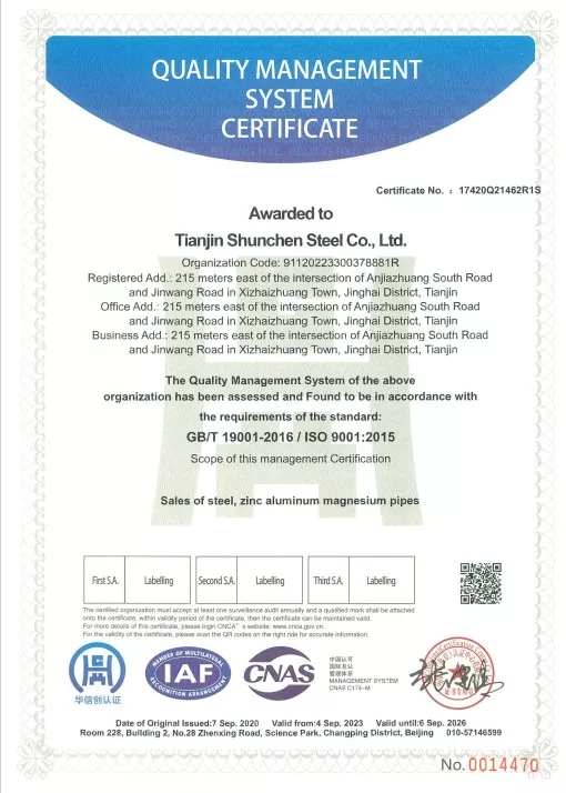 Normen: GB/T 3091-2015 „Geschweißte Stahlrohre für den Niederdruck-Flüssigkeitstransport“, GB/T 13912-2020 „Feuerverzinkte Stahlrohre“. Das Produkt hat die Tests Dritter bestanden und verfügt über einen Testbericht.