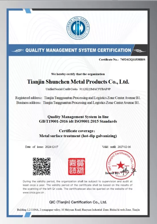 Das Stahl-U-Profil von Shunchen Industrial hat die ISO9001-Qualitätszertifizierung erhalten und entspricht den nationalen Standards. Wir stellen Materialprüfberichte und Verzinkungsdickenzertifikate von Drittanbietern zur Verfügung. Unsere Produktion nutzt fortschrittliche Produktionslinien, die 12 strenge Prozessschritte durchlaufen, gestützt auf über 20 Jahre Produktionskompetenz. Wir können auf eine 12-jährige Erfolgsgeschichte mit null Vertragsverstößen und null jährlichen Qualitätsvorfällen zurückblicken. Während des Produktionsprozesses werden drei Passivierungsbehandlungen angewendet, um die Alkalibeständigkeit verzinkter Produkte zu verbessern. Jedes fertige Produkt wird getrocknet, geprüft und veredelt, bevor es verpackt und versendet wird. Das Unternehmen verfügt über ISO 9000-, 3A-Systemzertifizierungen und EU-CE-Zertifizierung. Mit unseren 12 Prozessschritten und einem dreistufigen umfassenden Inspektionsmechanismus haben wir jährlich null Qualitäts- und Sicherheitsvorfälle erreicht und einen 12-Jahres-Rekord mit null Vertragsverstößen aufrechterhalten.