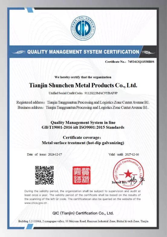 Wählen Sie Shunchen für zuverlässige Qualität. Wir verwenden hochwertigen Stahl Q235B oder Q355B, der durch Feuerverzinkung für Korrosionsbeständigkeit verarbeitet wird. Die Temperatur des Zinktopfs wird im Bereich von 450–460 Grad Celsius präzise kontrolliert, um eine starke Haftung der Zinkbeschichtung und keine fehlenden Stellen zu gewährleisten. Unsere Produkte entsprechen der ISO9001-Zertifizierung des Qualitätssystems und werden durch Inspektionsberichte Dritter zur Zinkbeschichtung bestätigt.